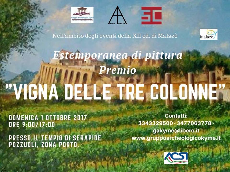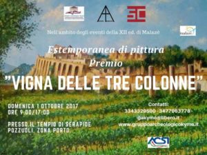 Il “Gruppo Archeologico Kyme” con il maestro d’arte Antonio Isabettini e la collaborazione dell’avvocato Massimo Schiano, organizzano l’estemporanea di pittura Premio “Vigna delle tre colonne” che si svolgerà domenica 1 ottobre 2017 dalle ore 9,00 alle 17,00 presso il Tempio di Serapide a Pozzuoli, zona porto.
